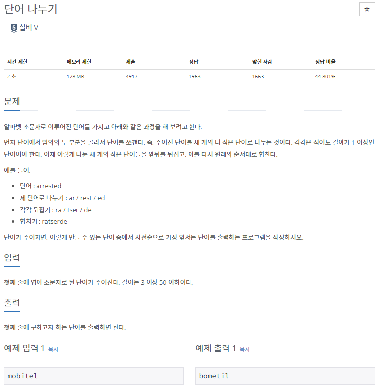 나눠지는 단어의 부분이 1이상이어야하므로 첫번째 for문을 len(word)-2까지, 두번째 for문을 i+1부터 len(word)-1까지, 마지막 for문을 j+1부터 len(word)까지 검사해주도록 하였다.