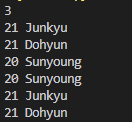 mem에 모두 추가가 되었으므로 이를 sort시켜준다. key=lambda x : x[0]은 age만 가지고 비교하도록 하기 위해 사용하였다.
