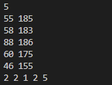 n을 입력받고 n만큼 for문을 통해 반복하여 weight, height값을 입력받아주었다. 그리고 이를 arr에 [weight,height]형태로 append해주었다.