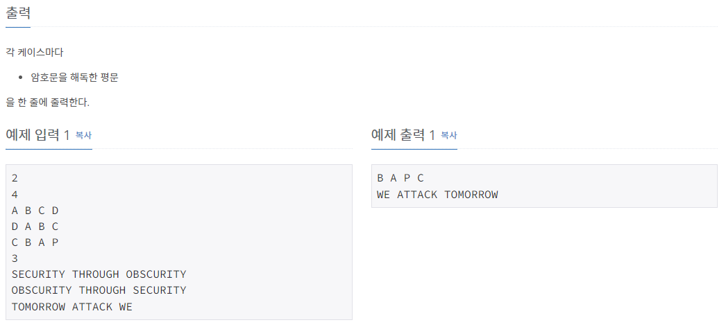 tc만큼 for문으로 반복시켜 한 문장의 단어 수인 n, 제 1 공개키인 k1, 제 2 공개키인 k2, 암호문인 p를 입력받아주었다.