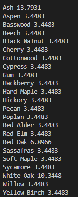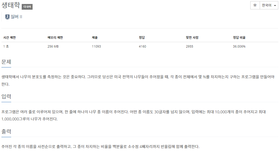 먼저 while문을 통해 word를 입력받아주었다. word에 아무 입력도 없을 때 break를 하도록 해주었다.word가 dic에 있다면 dic[word]에 1을 추가시켜주었고, 그렇지 않다면 dic[word]를 1로 지정해주었다.그리고 백분율을 구해야하기 때문에 while문을 돌 때마다 cnt값을 증가시켜주었다.사전 순으로 정렬해야 하므로 dic의 items를 sort해주고 이를 tree에 저장해주었다.백분율을 구하기 위해 value값을 cnt로 나누었고, 이를 100 곱해주었다. 그리고 올림자리 수를 4로 지정하였다.그리고 소수점 4번째자리까지 출력해야하므로 출력형식을 %.4f로 지정하여 출력해주었다.