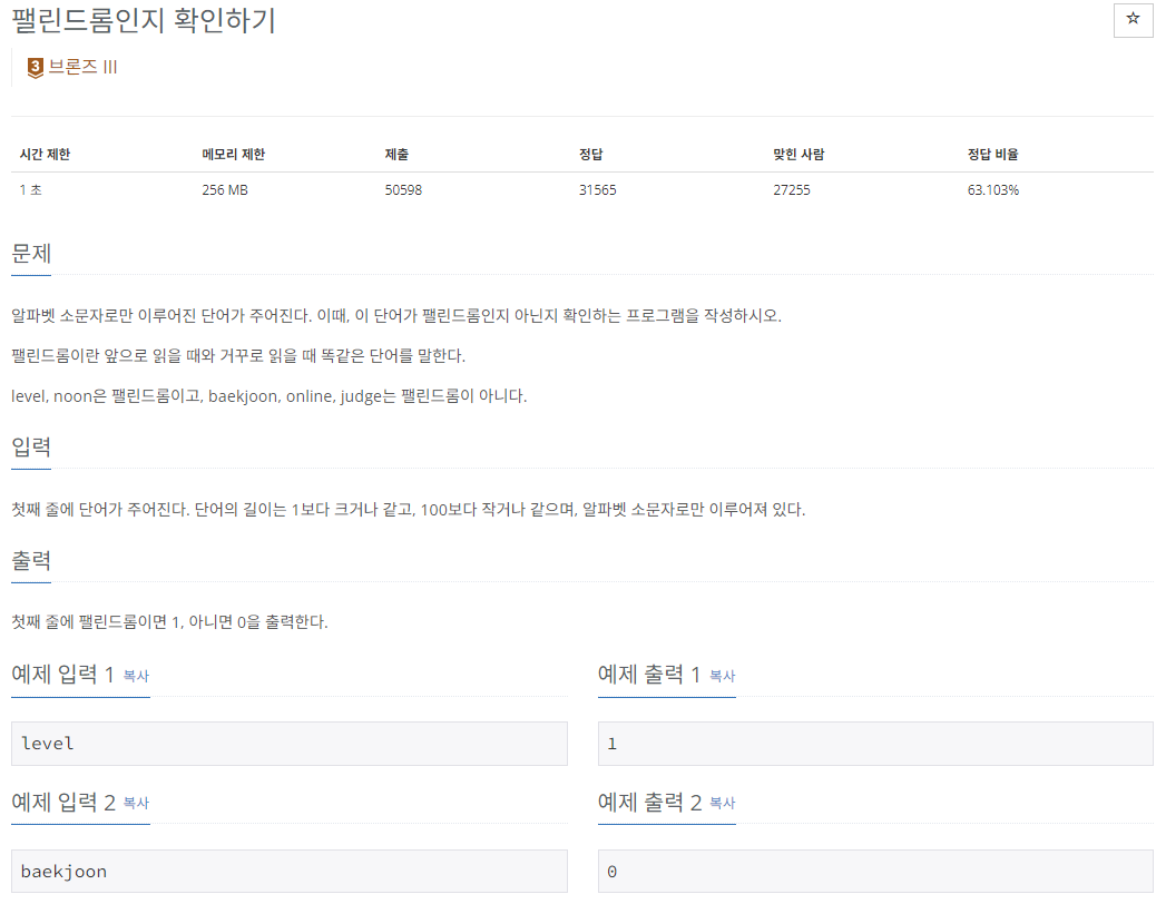 - palindrome(word)가 true면 "1" 출력, 그렇지 않으면 "0" 출력