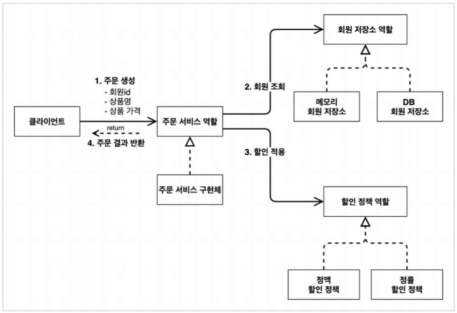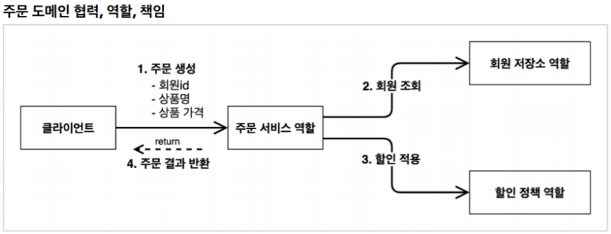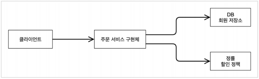 - 주문 생성 요청이 오면, 회원 정보를 조회하고, 할인 정책을 적용한 다음 주문 객체를 생성해서 반환한다.